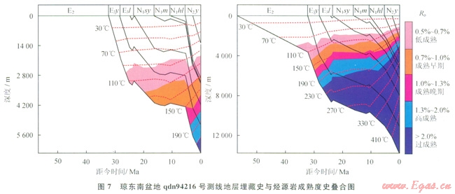 盆地的構(gòu)造沉降與埋藏史不同也導(dǎo)致成熱度演化軌跡的不同,快速的沉降與埋藏往往會(huì)對(duì)應(yīng)烴源巖的快速增熟和熱演化程度的升高。圖7為瓊東南盆地94216號(hào)測(cè)線的地層埋藏史與烴源巖成熟度史模擬疊合圖,2個(gè)人工井點(diǎn)分別位于凹陷邊緣與凹陷中央??梢钥闯觯貉鲁墙M存在2期快速沉降與Ⅰ期緩慢沉降階段,同時(shí)對(duì)應(yīng)2期烴源巖的快速增熟與Ⅰ期緩慢增熟過程。早期的快速沉降發(fā)生在32.0~23.3Ma為盆地裂陷期快速拉張階段,此階段雖然發(fā)生了烴源巖的快速增熟,但凹陷邊緣烴源巖的熱演化程度尚很低,剛剛或尚未進(jìn)入生油窗,凹陷中央早期演化樣度偏低,但晚期可進(jìn)入生氣窗;第2期的快速沉降發(fā)生于5.4Ma以來,盆地受紅河斷裂帶構(gòu)造體制轉(zhuǎn)換的影響加速沉降,沉積了巨厚的鶯歌海組,導(dǎo)致崖城組烴源巖熱演化程度迅速增高,達(dá)到高成熟過成熟階段。
