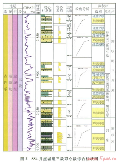 與同處于南海北部的珠江口盆地不同,瓊東南盆地缺少類似古珠江流域這樣的大河來為盆地提供巨厚的沉積物,因此,盆地內(nèi)物源相對(duì)不充分,較明顯的為來自盆地西北部的三亞河和東北部的萬泉河,帶來了一定的物源供給,形成了相對(duì)較厚的三角洲沉積。以鉆遇三亞河三角洲的SS4井為例(圖2,圖3-a、3-b),該井主要為灰白色、淺灰色礫巖、砂礫巖、粗砂巖、中砂巖夾薄層灰色碳質(zhì)泥巖,礫巖呈次棱角狀—次圓狀,分選差—中等,礫石直徑可達(dá)4cm,多次見沖刷面與滯留沉積,正韻律發(fā)育,沉積現(xiàn)象豐富(如槽狀交錯(cuò)層理、平行層理、波狀層理、變形層理、生物擾動(dòng)構(gòu)造、見炭化的植物莖),總體為辮狀河三角洲平原至前緣的沉積。砂巖粒度概率曲線有三段式與兩段式2種,分別代表了辮狀河道與水下分流河道沉積。顯微鏡下看以中粒長(zhǎng)石石英砂巖、粗粒長(zhǎng)石巖屑砂巖、長(zhǎng)石雜砂巖等為主,富含云母、長(zhǎng)石等不穩(wěn)定礦物,成熟度較低,反映較近源沉積環(huán)境。GR測(cè)井曲線上,下部表現(xiàn)為齒化鐘形,上部表現(xiàn)為大幅度微齒化箱形、鐘形、漏斗形,且以箱形為主,反映下部水動(dòng)力頻繁活動(dòng)。上部相對(duì)較穩(wěn)定。測(cè)井解釋煤層8層,總厚度為3.56m,主要的成煤環(huán)境為辮狀河三角洲平原。該井崖三段早期植物角質(zhì)豐度大,指示陸相環(huán)境,而晚期有孔蟲、海相溝鞭藻呈不連續(xù)但高濃度分布,表明該部位受到海侵影響。
