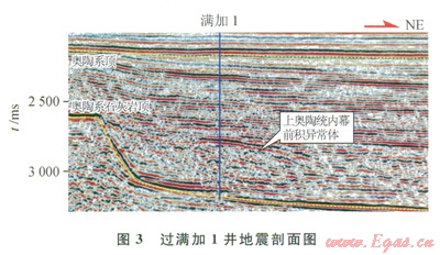 3)上奧陶統(tǒng)斜坡~陸棚相濁積巖在地震剖面上表現(xiàn)為異常反射或內(nèi)幕強反射,曾是多l5井的兼探層系。1995—2003年,通過塔中28、塔中29、塔中32、塔中33、滿南1等5口探井實鉆,認為除塔中33井上奧陶統(tǒng)內(nèi)幕強反射被證實為玄武巖外,其他內(nèi)幕強反射異常體皆為濁積砂巖沉積特征。2006年,發(fā)現(xiàn)滿加1井上奧陶統(tǒng)內(nèi)幕異常反射體,并認為是濁積砂巖沉積,針對上奧陶統(tǒng)濁積砂巖巖性圈閉鉆探滿加1井(圖3),實鉆表明上奧陶統(tǒng)內(nèi)幕異常反射與強反射是泥質(zhì)灰?guī)r的響應,以失利告終。盡管其間也有部分井鉆遇奧陶系碳酸鹽巖,也均未獲得突破。