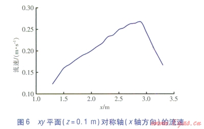 當貼附射流接近地面時,逐漸形成沖擊地板面的沖擊射流[7]。xy平面(z=0.1m)速度云圖見圖5,xy平面(z=0.1m)對稱軸(x軸方向)的流速見圖6。