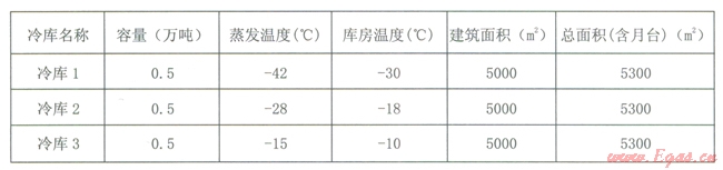 為便于計算,本文以總容量為1.5萬噸的冷庫為例進行具體計算,并將此冷庫設計成三座庫容量均為5000噸庫房溫度分別為30℃、-l8℃、-l0℃的冷庫。根據蒸發(fā)溫度與庫房溫度的關系,三座冷庫的蒸發(fā)溫度分別為-42℃、-28℃和-l5℃。其基本設計參數(shù)如表l。