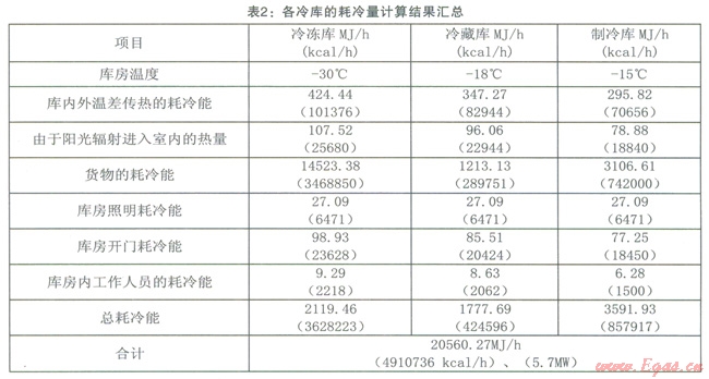 每個工作人員產生的熱量與庫房溫度有關。凍結間按l.59MJ/h(355kcal/h),低溫冷藏間按1.26MJ/h(300kcal/h),高溫冷藏庫按1.00MJ/h(240kcal/h)考慮。工作人員按50人考慮。計算可得三座冷庫庫房內工作人員產生的耗冷量分別為9.29MJ/h、8.63MJ/h、6.28MJ/h(2218kCal/h、2062kCal/h、1500kcal/h)。將各個冷庫耗冷量的計算結果匯總,列于表2。