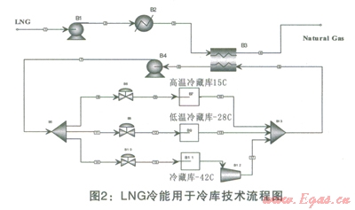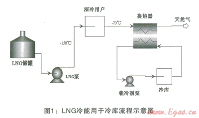 目前,國內LNG冷能利用技術尚在起步階段。全國冷庫的總容量達500多萬噸,基本上都是采用多級電壓縮制冷裝置維持冷庫的低溫,而利用LNG冷能作為冷庫的冷源,則既可以減少壓縮制冷系統(tǒng)的投資,又可以回收LNG的冷能,減少耗電量,節(jié)約能源。