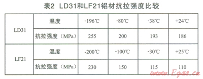 常見的氣化器材質(zhì)一般為LF21(美國牌號為3003)和LD31(美國牌號為6063),鋁合金LD31材質(zhì)從+24℃~-196℃強(qiáng)度相近,在常溫與低溫時(shí),主體結(jié)構(gòu)應(yīng)力均衡、抗拉強(qiáng)度也是均衡的。而LF2l在常溫與低溫時(shí),從+25℃~-200℃強(qiáng)度相差懸殊近l倍,抗拉強(qiáng)度相差較大,力學(xué)的差異也較大,具體抗拉強(qiáng)度參數(shù)見表2。在冷熱交替頻繁時(shí)容易造成金屬疲勞現(xiàn)象,而導(dǎo)致較易出現(xiàn)裂縫。但是LD31鋁材的抗氧化性能低于LF21鋁材,所以LD31鋁材需要進(jìn)行抗氧化防護(hù)。氣化器材質(zhì)宜選用LD31鋁型材。對于相同長度的換熱翅片管,顯然翅片管管徑大的氣化量大。