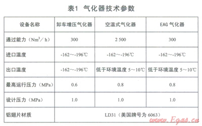 (1)卸車增壓氣化器、空溫式氣化器、EAG氣化器(技術(shù)參數(shù)見表l)。