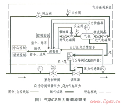 CS壓力遙調(diào)系統(tǒng)屬氣動壓力遙調(diào)系統(tǒng),它根本原理是通過遠(yuǎn)程控制氣包上安裝的兩個電磁閥的啟閉進(jìn)而調(diào)整氣包的壓力,氣包的壓力通過反饋管引至調(diào)壓器的導(dǎo)閥來調(diào)整出站壓力。其原理圖見圖1。
