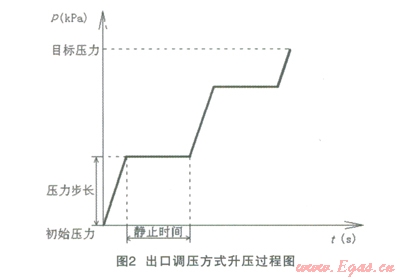 (2)自動調(diào)壓的出口調(diào)壓功能。通過設(shè)置壓力步長、靜止時(shí)間、目標(biāo)壓力等狀態(tài)參數(shù)在站控室的控制面板上進(jìn)行壓力調(diào)整,通過出口壓力的反饋值調(diào)整比對,最終達(dá)到設(shè)定的出口壓力。其調(diào)整的過程見圖2。