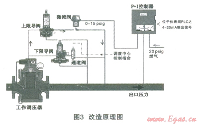 從原理圖上看,改造主要分兩部分:氣動控制部分(工藝設(shè)備部分)、電子控制部分(自控部分)。原主調(diào)壓器上的導(dǎo)閥利用做下限導(dǎo)閥。增加的設(shè)備主要有:機(jī)械式比例積分控制器(P+I控制器)、微流閥、上下限導(dǎo)閥(利用原導(dǎo)閥,增加上限導(dǎo)閥)、反饋管。電子控制部分改造包括:電纜導(dǎo)管的安裝、PLC模塊機(jī)柜的安裝、站內(nèi)P+I控制箱的安裝及SCADA界面的設(shè)計(jì)。