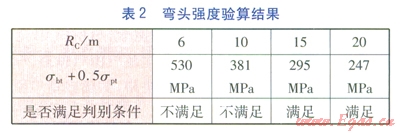 當(dāng)彎頭的計(jì)算曲率半徑RC分別取6、10、15、20m時(shí),由式(9)~(17)得到的彎頭強(qiáng)度驗(yàn)算結(jié)果見表2.充分考慮安全余量,彎頭的曲率半徑宜選取20m。