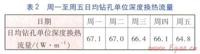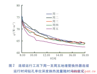 連續(xù)運(yùn)行工況下,周一至周五地埋管換熱器連續(xù)運(yùn)行時(shí)間鉆孔單位深度換熱流量隨時(shí)間的變化見圖2。由圖2可知,隨著時(shí)間推移,鉆孔單位深度換熱流量整體呈下降趨勢(shì),雖然周一二這種變化并不明顯,但從周三開始,特別是周五,地埋管換熱器的換熱能力已有明顯降低。前一日運(yùn)行結(jié)束時(shí)的鉆孔單位深度換熱流量較低,但次日基本能恢復(fù)至前一日開始運(yùn)行時(shí)的水平。周一至周五日均鉆孔單位深度換熱流量見表2。由表2可知,經(jīng)過5d的連續(xù)運(yùn)行,鉆孔單位深度換熱流量從67.1W/m下降至64.8W/m,下降幅度為3.4%。