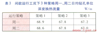 間歇運(yùn)行工況下3種策略周一、周二日均鉆孔單位深度換熱流量見表3。由表3可知,與連續(xù)運(yùn)行工況相比,間歇運(yùn)行工況3種策略的地埋管換熱器換熱能力均有所改善。策略1、2的地埋管換熱器換熱能力優(yōu)于策略3,這表明地埋管換熱器停運(yùn)時(shí)間越長(zhǎng),越有助于改善其換熱能力。策略l、2均為全天運(yùn)行6h,但策略l的地埋管換熱器換熱能力卻高于策略2。這說明,在一段時(shí)間內(nèi),采取相對(duì)分散的土壤溫度恢復(fù)時(shí)間比采取相對(duì)集中的土壤溫度恢復(fù)時(shí)間效果更好。