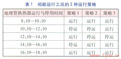 采用恒定地埋管換熱器進(jìn)水溫度的方法,實(shí)驗(yàn)?zāi)M夏季工況下地埋管換熱器在連續(xù)運(yùn)行工況、間歇運(yùn)行工況下的換熱能力。對(duì)于連續(xù)運(yùn)行工況,地埋管換熱器在周一至周五的8:10—l8:10連續(xù)運(yùn)行,其他時(shí)間停用。對(duì)于間歇運(yùn)行工況,地埋管換熱器在周一至周五的8:10—18:10間歇運(yùn)行,其他時(shí)間停用,并設(shè)計(jì)了3種運(yùn)行策略(見表l)。