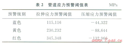 該處管材為X70鋼,管道直徑為1016mm,管道壁厚為14.6mm,設(shè)計(jì)內(nèi)部輸送壓力為l0MPa,按操作和安裝溫差20℃計(jì)算的管道容許軸向附加拉、壓縮應(yīng)力分別為383.72MPa和-147.74MPa,相應(yīng)的應(yīng)力預(yù)警閾值如表2所示。
