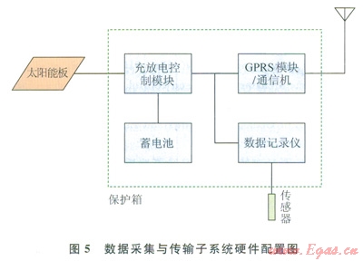在電源保障上,因數(shù)據(jù)采集與傳輸子系統(tǒng)硬件均選用低功耗元器件,配備太陽(yáng)能和蓄電池供電系統(tǒng)便可實(shí)現(xiàn)長(zhǎng)期野外工作,基本硬件配置如圖5所示。