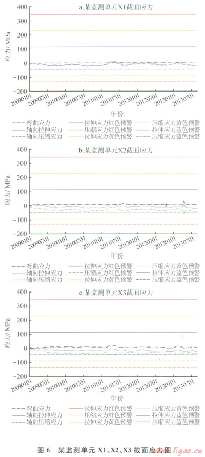 從系統(tǒng)監(jiān)測(cè)成果看,自2008年12月至今,應(yīng)變監(jiān)測(cè)Xl、X3截面軸向附加應(yīng)力未達(dá)到過(guò)預(yù)警閾值;應(yīng)變監(jiān)測(cè)X2截面在2013年4月1 5日因軸向附加壓應(yīng)力超過(guò)容許附加應(yīng)力的30%,曾出現(xiàn)過(guò)l次藍(lán)色預(yù)警。管道軸向附加應(yīng)力總體在溫差和輸送內(nèi)壓作用的合理范圍內(nèi)波動(dòng)。相關(guān)管道管理部門(mén)根據(jù)系統(tǒng)監(jiān)測(cè)成果,及時(shí)掌握了穿越活動(dòng)斷裂帶管道的力學(xué)狀態(tài)。