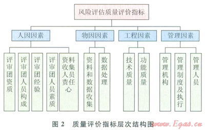 依據(jù)對評價結果的量化程度,將風險評估質量評價方法大致分成定性和定量兩大類。定性方法主要有專家評分法、風險矩陣法、檢查表法和影響圖法等;定量方法主要有風險函數(shù)法、關聯(lián)度函數(shù)法和指標體系等。由于指標體系法其評價方法簡單、易于操作,故筆者采用指標體系法來進行質量評價。