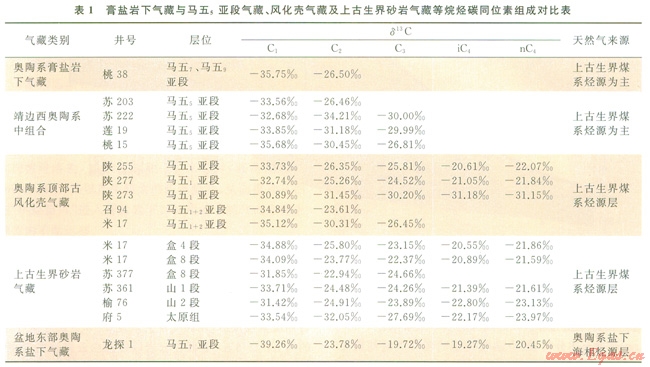 靖邊氣田西北側(cè)已有1口探井(桃38井),奧陶系馬家溝組馬五段地層保存齊全,在鉆穿馬五6亞段膏鹽巖層后,于馬五7、馬五9亞段白云巖中見到較好的含氣顯示(氣層距奧陶系頂面風(fēng)化殼超過200m),后經(jīng)酸化改造、試氣獲得l2.91×104m3/d的較高產(chǎn)工業(yè)氣流,成為盆地內(nèi)首次在膏鹽巖下深層獲得工業(yè)氣流的探井,產(chǎn)層天然氣樣品的甲烷碳同位素值為-35.75‰,乙烷碳同位素值為-26.50‰,與盆地本部來源于上古生界煤系烴源巖的奧陶系頂部風(fēng)化殼氣藏、上古生界砂巖氣藏、奧陶系中組合馬五5亞段氣藏等的天然氣烷烴碳同位素組成基本一致(表1)。這類煤系烴源氣藏的甲烷碳同位素值一般在-30‰~-36‰之間,乙烷碳同位素值為-23‰~-30‰之間[18-22],證實(shí)了膏鹽巖下圈閉的有效性及氣源主要來自上古生界煤系烴源巖的基本成藏特征。另外,近期通過靖邊氣田勘探早期鉆入膏鹽巖下深層的探井復(fù)查分析,也發(fā)現(xiàn)l0余口探井在膏鹽巖下有一定的含氣顯示,但由于當(dāng)初勘探重點(diǎn)是奧陶系頂部的馬五1+2亞段風(fēng)化殼氣藏,對馬五5亞段及以下的中下組合含氣層系認(rèn)識不足,加之個(gè)別井試氣效果不理想,也就沒有進(jìn)一步深入勘探之。