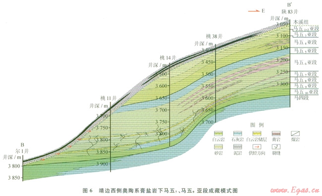前已述及,馬五6膏鹽巖下發(fā)育馬五7、馬五9亞段及馬四段等多個(gè)儲(chǔ)集層段,其間又為馬五8、馬五10亞段等蒸發(fā)巖組合分隔,各自都具有相似的成藏地質(zhì)背景,因而都具有一定的成藏潛力。其次,即使在馬五8、馬五10亞段乃至馬五6亞段等蒸發(fā)巖層段中也常夾有一定儲(chǔ)集性的白云巖夾層,它們雖在橫向上規(guī)模相對較小,但在局部也可能形成有效的工業(yè)性聚集,對于膏鹽巖下的勘探也有一定的實(shí)際意義。