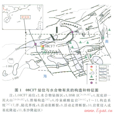 08CF7站位位于南海北部神狐海區(qū)。該海區(qū)位于南海北部陸坡中段,界于兩沙海槽和東沙群島之間,構(gòu)造上處于珠江口盆地珠Ⅱ凹陷,自中新世以來(lái)進(jìn)入構(gòu)造沉降[30]。新生代沉積厚度介于1000~7000m,有機(jī)質(zhì)含量為0.2%~l.9%[5,29]。水深800~2000m,海底地形復(fù)雜且坡度變化較大。高分辨率地球物理調(diào)查表明,該海域廣泛發(fā)育斷裂一褶皺體系、泥火山、泥底辟等構(gòu)造,且海底以下150~350m廣泛分布BSR,具有較好的水合物形成和賦存的地質(zhì)條件 [5,18,21],且于2007年在該海區(qū)成功鉆取到水合物實(shí)物樣品[31]。