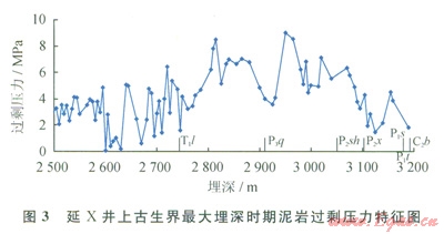 一般來說浮力和水動力是油氣二次運移的主要動力,在常規(guī)油氣二次運移過程中浮力和水動力作用較強。但在鄂爾多斯盆地上古生界由于儲層成巖早期壓實作用和膠結(jié)作用強烈,因而在造成儲層致密化的同時,也導(dǎo)致儲層中的自由水大為減少,從而難以產(chǎn)生較強的浮力和水動力[28]。另一方面,流體南高勢區(qū)向低勢區(qū)運移的原理只適用于連通的水力系統(tǒng),而不適用于多個封隔體之間。泥巖壓實研究表明,盆地上古生界地層在三疊紀末 白堊紀發(fā)育“非均衡壓實” [16-17,21,24,26],該區(qū)最大埋深時期(白堊紀)泥巖過剩壓力幅度介于0~10MPa,過剩壓力峰值出現(xiàn)在三疊系劉家溝組—上石盒子組(圖3),在壓力封存箱的上下、側(cè)向高壓泥巖阻隔之間,很難出現(xiàn)區(qū)域運移??梢?,鄂爾多斯盆地上古生界缺乏天然氣大規(guī)模、長距離運移的動力條件。