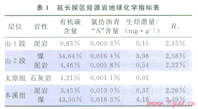 延長探區(qū)上古生界烴源巖為海陸交互相暗色泥巖、煤層及生物屑灰?guī)r,層位主要分布于下二疊統(tǒng)山西組、中石炭統(tǒng)本溪組和上石炭統(tǒng)太原組,平面分布穩(wěn)定,其中山西組泥巖厚度介于70~80m,煤層厚度介于l~7m,主要分布于山2段;太原組石灰?guī)r厚度介于10~40m,本溪組泥巖厚度介于l5~35m,煤層厚度介于1~6m。從地球化學(xué)指標來看(表1),山l段泥巖生烴條件較差,平均有機碳含量僅為0.63%,山2段和本溪組較好,其泥巖有機碳含量大于3%,煤層有機碳含量大于30%;太原組石灰?guī)r有機碳含量為1.21%,氯仿瀝青“A”含量和生烴潛量指標均較低。上述情況表明:該區(qū)主力烴源巖為山2段和本溪組暗色泥巖及含煤層系。該區(qū)上占生界烴源巖鏡質(zhì)體反射率(R。)為1.59%~2.65%,普遍超過2%,處于過成熟干氣階段,生烴強度在28×108~40×108m3/km2。生烴量大,氣源充足,具有“廣覆式”生烴特征[3-9]。