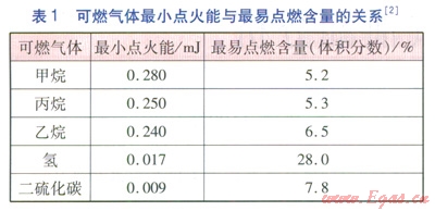 最小點(diǎn)火能指能夠引起可燃?xì)怏w與空氣混合物燃燒或爆炸的最小火花能量,單位為mJ,通常用來(lái)衡量可燃?xì)怏w混合物的點(diǎn)火敏感度。最小點(diǎn)火能不僅與可燃?xì)怏w的種類有關(guān),而且與可燃?xì)怏w的含量、點(diǎn)燃源的種類有關(guān)。當(dāng)可燃?xì)怏w達(dá)到最易點(diǎn)燃含量時(shí),其點(diǎn)燃能量最小。可燃?xì)怏w最小點(diǎn)火能與最易點(diǎn)燃含量的關(guān)系見(jiàn)表1。表l中的最小點(diǎn)火能是用電火花裝置測(cè)量得到的。