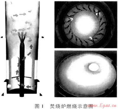 焚燒爐的工作原理是將原料氣引入燃燒器產(chǎn)生高速渦流,通過(guò)自然吸入空氣,使燃料氣和氧氣在爐內(nèi)充分混合、燃燒,爐膛排出氣體以較高的速度沖高、向大氣擴(kuò)散,減少高含硫氣井測(cè)試過(guò)程中對(duì)環(huán)境和人員的危害[1~2]。圖1為焚燒爐爐膛燃燒示意圖。