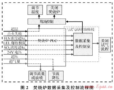 當(dāng)焚燒爐2套點(diǎn)火系統(tǒng)點(diǎn)火失敗、監(jiān)測(cè)點(diǎn)可燃?xì)怏w達(dá)到爆炸極限或者SO2、H2S濃度超標(biāo)時(shí),焚燒爐控制系統(tǒng)將向井場(chǎng)數(shù)據(jù)采集控制系統(tǒng)發(fā)出緊急關(guān)斷報(bào)警信號(hào),并關(guān)閉井口;當(dāng)超溫、超壓或超氣量時(shí),焚燒爐控制系統(tǒng)將向井場(chǎng)數(shù)據(jù)采集控制系統(tǒng)發(fā)出緊急關(guān)斷報(bào)警信號(hào),并進(jìn)行調(diào)節(jié)[3~6]。具體邏輯控制流程見(jiàn)圖2。