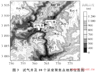 擴(kuò)散模型計(jì)算的參數(shù)為原料氣組分體積分?jǐn)?shù)(CH470.6%、H2S20.0%、CO28.93%),原料氣量(70×104m3/d),爐膛設(shè)計(jì)排出氣體速度(21.23m/s),排出溫度(924℃),氣井所處地形、地貌及氣象等數(shù)據(jù);模型計(jì)算采用的試氣井及周邊10km范圍10個(gè)濃度聚集點(diǎn)的地形位置參見(jiàn)圖3。