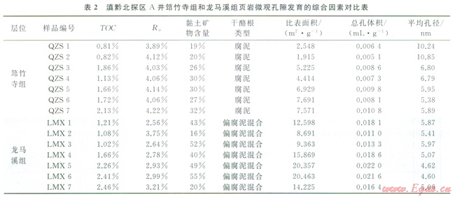 泥貝巖微觀孔隙的發(fā)育演化,不是受單一的條件控制,而是巖性、礦物組合、溫壓等多方面因素影響的綜合體[526]。有機碳含量、干酪根類型、黏土礦物與含量、熱演化程度等因素,均不同程度地控制著泥頁巖微觀孔隙的發(fā)育[26]。通過荇類分析化驗的對比研究發(fā)現(xiàn),滇黔北高演化區(qū)筇竹寺組泥頁巖微觀孔隙的發(fā)育演化也與上述因素有著密切的關(guān)系。