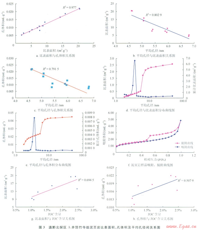 對滇黔北A井筇竹寺組泥頁巖樣品進行了比表面積測量和孔徑在1.5300.0nm樣品的孔體積測試,得出筇竹寺組頁巖氣儲層的比表面積為1.9157.691m2g.平均為5.185m2g;孔體積為0.00510.0108mLg,平均為0.0080mLg;平均孔徑為5.3810.85nm。反映筇竹寺組泥頁巖的比表面積和孔體積均較大。有利于頁巖氣的吸附。從中也可以看出,其孔比表而積與孔體積二者之間具有較好的正相關(guān)性,即隨著比表面積的增大??左w積也隨之增大(3-a3-b)。與之相反。比表面積、孔體積與平均孔徑則呈負相關(guān)性。即比表面積、孔體積均隨孔徑的增大而減小(3-c、3-d).且當孔徑小于10nm時,孔體積分布曲線很陡,而當孔徑大于等于10nm時,曲線則逐漸變得平緩,說明孔徑范圍在18nm內(nèi)的孔隙對泥頁巖比表而積、孔體積值的貢獻最大(3-c),即小孔隙越發(fā)育,頁巖的比表面積、孔體積越大,越有利于泥頁巖對頁巖氣的吸附聚集。