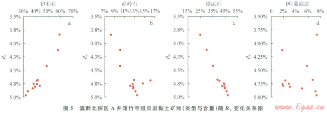 研究區(qū)筇竹寺組頁巖熱演化程度較高,R。均大于3.0%。根據(jù)巖心不同黏土礦物含量隨R。的變化關(guān)系圖(5)可以看出,隨R。的增大,具有較大比表面積的伊利石含量增大、伊/蒙混層含量減少,具有較小比表面積的綠泥石含量增大、高嶺石含量增大。而上覆的龍馬溪組頁巖熱演化程度相對低些(R。多小于3.0),與筇竹寺組頁巖黏土礦物相比,其伊利石含量高(13%~36)、伊/蒙混層含量比較少(2%~6)、綠泥石含量高(13%~32)、高嶺石含量高(6%~9)。因而出現(xiàn)了筇竹寺組黏土礦物間微孔隙的比表面積和孔體積遠比龍馬溪組小的情形,導致其比表面積和孔體積均較小的狀況(2)。因此,熱演化程度通過對黏土礦物類型與含量的影響,也同樣控制著黏土礦物間微孔隙的發(fā)育程度。由此得出,已處于過成熟中期后的滇黔北筇竹寺組頁巖層,經(jīng)歷悠久的地質(zhì)作用過程和過高熱演化程度嚴重制約了其微觀孔隙結(jié)構(gòu)特征,呈現(xiàn)微孔隙驟減和比表面積、孔體積明顯較小的情形,不利于頁巖氣的吸附儲集,結(jié)果出現(xiàn)筇竹寺組頁巖氣富集程度不如龍馬溪組的狀況。