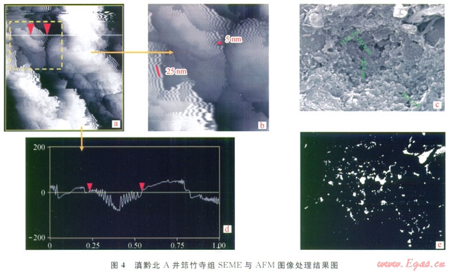 通過將A井筇竹寺組具有代表性的頁巖巖心拋光樣品進行AFMSEME圖像處理與分析,將圖像數(shù)據(jù)導入ArcGIS平臺中進行柵格重分類分析,圖像中白色區(qū)域為孔隙或裂隙分布區(qū)(4-d、4-c)。由此計算出不同樣品中微觀孔隙的孔隙數(shù)量及其面孔率(1)。與龍馬溪組頁巖相比,筇竹寺組頁巖具有微觀孔隙數(shù)量多、孔徑小、單孔面積小、而孔率大的特征。由AFM剖面圖清晰地顯示出,規(guī)則排列的柵格間為納米級孔隙,具有鋸齒狀緊密排列的結(jié)構(gòu)特征(4-a、4-c),這種規(guī)則的呈明暗相間的柵格狀表面形態(tài)特征可能是頁巖中干酪根大分子團緊密排列的結(jié)果[27-28]