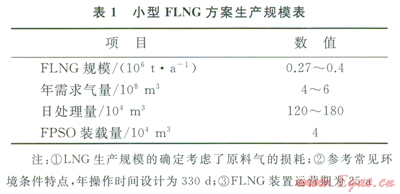 國際上FLNG技術(shù)發(fā)展已基本成熟,部分工藝和關(guān)鍵設(shè)備也已獲得類似海上工程應(yīng)用驗證,影響FLNG方案可行性的關(guān)鍵點也已明確,主要集中在FPSO設(shè)計、系泊系統(tǒng)、工藝適用性、LNG卸料系統(tǒng)等核心領(lǐng)域。本文針對某海外區(qū)塊A設(shè)計了0.5MTPA以下規(guī)模的小型FLNG方案,具體設(shè)計規(guī)模如表l所示,同時介紹了方案特點,并結(jié)合相關(guān)技術(shù)的海上類似應(yīng)用案例分析了小型FLNG方案的技術(shù)可行性[3-5]。