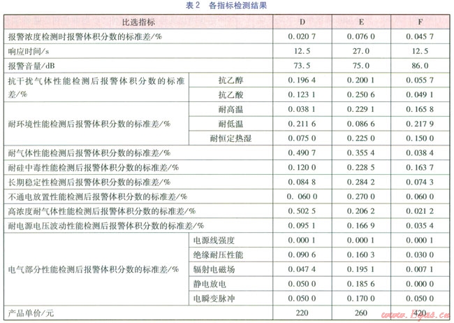 對檢測數(shù)據(jù)進(jìn)行初步處理,變換成具有可比性的數(shù)據(jù)。由于各檢測項目中除報警音量、響應(yīng)時間、產(chǎn)品單價為直接測得值可以直接比較外,其他項目檢測結(jié)果均表現(xiàn)為一組產(chǎn)品報警濃度檢測時的報警體積分?jǐn)?shù)值,而報警體積分?jǐn)?shù)值并非越大越好或越小越好,而是要求一組數(shù)據(jù)與產(chǎn)品設(shè)定的報警體積分?jǐn)?shù)值偏離得越小越好,因此把各組數(shù)據(jù)轉(zhuǎn)化為用標(biāo)準(zhǔn)差表示的數(shù)據(jù),見表2。