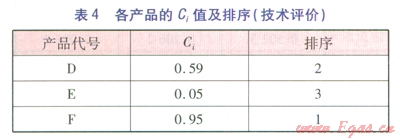 若不考慮經(jīng)濟性的影響,單從技術(shù)方面對產(chǎn)品進(jìn)行評價,按同樣方法進(jìn)行計算,得到各產(chǎn)品的Ci值及排序見表4。可見,技術(shù)排序與綜合評價排序相同,但是,各產(chǎn)品的技術(shù)優(yōu)劣勢很明確,F產(chǎn)品在技術(shù)上明顯優(yōu)于D產(chǎn)品。
