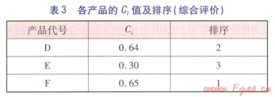 根據(jù)計算得到的Ci值大小進(jìn)行排序,Ci值越大,越接近于l,說明越接近于最優(yōu)方案,產(chǎn)品綜合評價越優(yōu)。經(jīng)計算得到各產(chǎn)品的Ci值,其排序見表3。