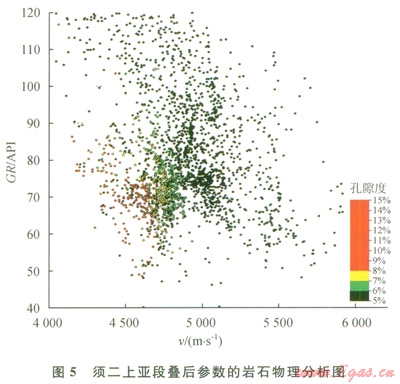 安岳地區(qū)須二上亞段主要為高孔砂巖、致密砂巖和泥巖,從疊后參數的巖石物理分析結果看,伽馬、速度、孔隙度各類樣點值分散、疊置,常規(guī)屬性難以區(qū)分出高孔砂巖(5)。