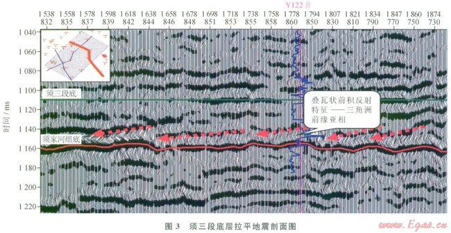 地震相主要是通過地震反射外部幾何形態(tài)、內部反射結構、振幅、連續(xù)性、波形排列以及視頻率等特征進行識別與劃分。在區(qū)域最大湖泛面(須三段底)拉平地震剖面上,對于整個須二段可見清晰的三角洲前緣亞相疊瓦狀前積反射結構,兩個平行的反射層之間存在幾組傾斜的、疊瓦狀排列的同相軸(3),可作為判斷物源方向的依據。但對該區(qū)須二上亞段2030ms小時窗內(厚度5085m),地震微相特征不明顯,后續(xù)沉積微相的劃分需要借助地震屬性的分析。