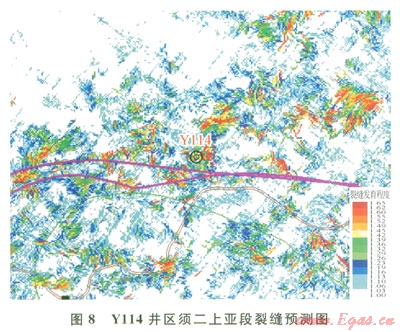 結合鉆井測試資料驗證性分析(7),工業(yè)氣井主要分布在以高孔砂巖為主的水下分流河道,微氣井或干井主要分布于以泥巖為主的水下分流間灣,地震預測與鉆井成果吻合較好。僅Yll4井位于水下分流間灣,但該井在須二上亞段產工業(yè)氣流,究其原因:①鄰近水下分流河道;②該區(qū)儲層為裂縫孔隙型,鉆井產能的高低與高孔砂巖及裂縫的發(fā)育程度均密切相關,針對井區(qū)地震裂縫預測結果顯示,該層段裂縫發(fā)育,提高了儲層滲流能力(8)。