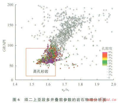 通過安岳地區(qū)須二上亞段單井及多井疊前參數的巖石物理實際資料分析,表明up/us。與高孔砂巖也呈明顯對應關系(6)。因此,與up/us相關的AVO梯度G能夠預測高孔砂巖的分布規(guī)律。