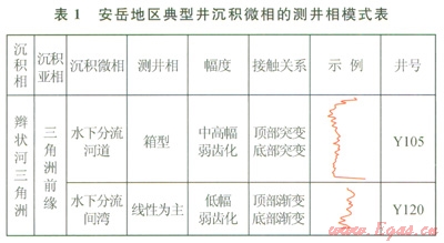 本次研究采用6級劃分方案(巨旋回、超長期旋回、長期旋回、中期旋回、短期旋回、超短期旋回),筆者以Yl05井為例,將須二段劃分為一個中期旋回,即一個上升半旋回,代表基準面上升,可容納空間增加,對應三角洲前緣亞相。該區(qū)典型井沉積微相的測井相模式如表1所示。這一時期總體上為一個水域變寬、沉積物粒度逐漸變細的時期,層序疊加樣式為退積式;在其內部進而劃分出兩個短期旋回,分別對應須二下亞段和須二上亞段,其中須二上亞段GR曲線呈箱狀(22332316m),說明有大套砂體疊置,層序疊加樣式為加積式到退積式,識別為可容納空間增加的上升半旋回(2)。