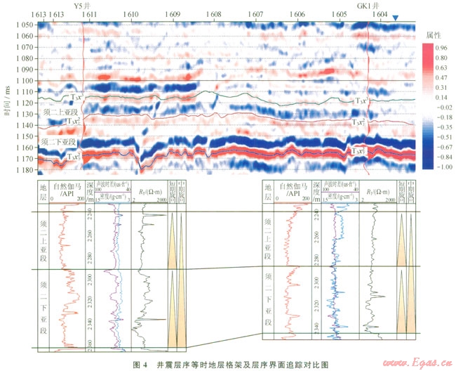 由于河湖相地層橫向變化大,而層序界面的追蹤對比必須是等時的、精細的,因此,在單井層序劃分的基礎上,以區(qū)內8口典型井合成地震記錄為橋梁,以波形、波組特征以及能量的相關性為識別依據,在高分辨率處理的地震資料上進行層序界面的對比追蹤,最終建立該區(qū)須二段等時地層格架,確保了后續(xù)地震屬性的準確提取。圖4是以Y5、GKl井為例的連井解釋剖面。