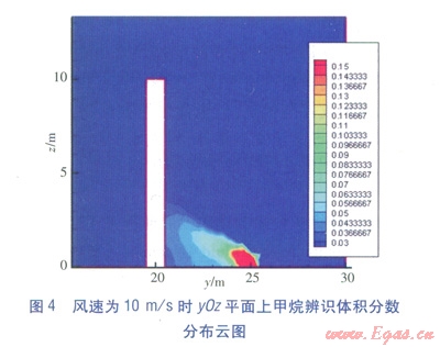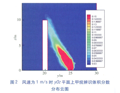 不同風(fēng)速下yOz平面上甲烷辨識(shí)體積分?jǐn)?shù)分布云圖(視線方向?yàn)?span lang="EN-US">x軸負(fù)方向)見圖2~4。由圖2可知,當(dāng)風(fēng)速為1m/s時(shí),障礙物迎風(fēng)面危險(xiǎn)體積分?jǐn)?shù)范圍分布在7~10m高度范圍內(nèi)。當(dāng)風(fēng)速為5m/s時(shí),分布在0~5m高度范圍內(nèi)。當(dāng)風(fēng)速為l0m/s時(shí),分布在0~3m高度范圍內(nèi)。