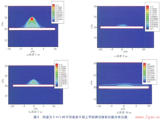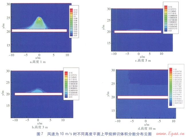 由圖6可知,當(dāng)風(fēng)速增大至5m/s時(shí),在z=1m平面上,障礙物近壁面甲烷辨識(shí)體積分?jǐn)?shù)聚積寬度達(dá)到l0m,危險(xiǎn)體積分?jǐn)?shù)范圍分布高度比風(fēng)速為1m/s時(shí)有所降低,約在5m以下。雖然在z=10m處仍可觀測到甲烷辨識(shí)體積分?jǐn)?shù),但不足以構(gòu)成威脅。