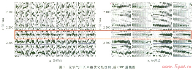 高質(zhì)量的疊前道集組合,是地震疊前氣水識別的基礎(chǔ)。疊前道集數(shù)據(jù)優(yōu)化的目的:①凈化道集背景;②拉平道集;③挖掘AVO特征。其要點包括:恢復(fù)和保持CRP道集中各道之間相對振幅關(guān)系,提高疊前道集的信噪比,從而提高道集數(shù)據(jù)的分辨率,尤其是要正確地確定反射界面的位置、剩余時差校正等,最大可能地消除非油氣或巖性因素引起的振幅隨炮檢距的變化,以獲得高信噪比、高分辨率和高保真度的疊前道集數(shù)據(jù)。元壩氣田海相礁灘儲層含氣AVO異常響應(yīng)特征為3類,但是入射角小,同時還受噪音等干擾,其特征不是很明顯(圖1左紅框內(nèi))。經(jīng)過對動校正后的道集進行優(yōu)化處理后,凸現(xiàn)了AVO響應(yīng)特征、提升了信噪比(圖1右紅框內(nèi)),為疊前精細反演提供了相對高質(zhì)量的道集數(shù)據(jù)。