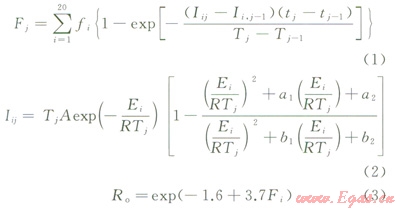 式中Fj為井中某地層底界第j個埋藏點(diǎn)的化學(xué)動力學(xué)反映程度,其值范圍0~0.85;fi(i=1,2,3,…,20)為化學(xué)計(jì)量因子或權(quán)數(shù);tj為該井該地層底界的第j個埋藏點(diǎn)的埋藏時間,Ma;Tj為該井該地層底界的第j個埋藏點(diǎn)的古地溫,K;R為氣體常數(shù),其值8.24J/(mol·K);A為頻率因子或指前因子,其值為l013s-1;Ei(i=l,2,3,…,20)為活化能,其值范圍42~420kJ/mol;a、b為校正系數(shù),a1=2.334733,a2=0.250621,b1=3.330657,b2=1.181534。