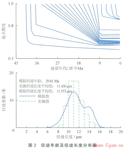 磷灰石裂變徑跡法的熱史模擬步驟為:①根據(jù)已有熱參數(shù)資料,給出熱史約束條件;②設(shè)定大量的溫度時間曲線,通過正演求出徑跡長度、徑跡年齡模擬值;③將正演結(jié)果與實(shí)測徑跡長度、年齡進(jìn)行比較,獲得最佳模型,即得到熱史模擬結(jié)果。