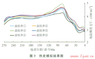 熱史模擬結(jié)果(圖3)表明:南黃海古地溫梯度自二疊系沉積開始至上白堊紀(jì)(距今約70Ma)一直呈上升趨勢,最高至5.0℃/l00m,其間有2次快速升高(距今270~260Ma和130~70Ma)和1個平穩(wěn)期(距今260~130Ma),平穩(wěn)期地溫梯度在4.0℃/l00m左右,70Ma至今地溫梯度總體呈下降趨勢,現(xiàn)今地溫梯度最低,為3.0℃/l00m左右;在最高地溫梯度處(距今約70Ma),各虛擬井的數(shù)值差別最大,最大差別可達(dá)1.0℃/l00m;新近紀(jì)和第四紀(jì)沉積對古生界烴源巖的深埋增熟作用由于該時期地溫梯度的降低而減弱。