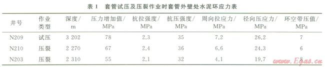 該作業(yè)使作用在井內(nèi)套管的內(nèi)壓力大幅度升高。四川盆地頁(yè)巖氣井Æl39.7mm油層套管固井后(套管壁厚9.17mm,井眼尺寸215.9mm)對(duì)套管柱試壓及壓裂作業(yè),井口壓力高達(dá)60MPa。N203井等井固井質(zhì)量?jī)?yōu)質(zhì)率100%,但試壓或光套管壓裂作業(yè)后均出現(xiàn)環(huán)空帶壓。該區(qū)塊水泥石楊氏模量l0GPa,泊松比0.19,其余計(jì)算條件及結(jié)果如表l所示,由公式(1)和(2),試壓或壓裂作業(yè)后,套管壁處水泥環(huán)周向應(yīng)力均超過(guò)抗拉強(qiáng)度,發(fā)生拉伸破壞,導(dǎo)致水泥環(huán)密封失效。